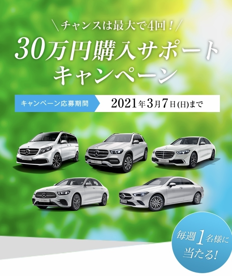 キャンペーン開催中のメルセデス・ベンツ正規販売店で、毎週1名様に抽選で30万円分の新車購入サポートをプレゼント致します‼️🤲